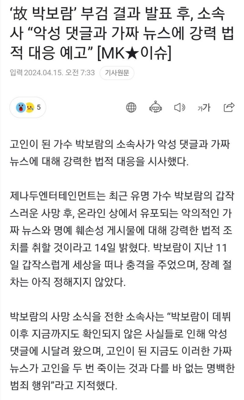 ‘故 박보람’ 부검 결과 발표 후, 소속사 “법적 대응 예고"
