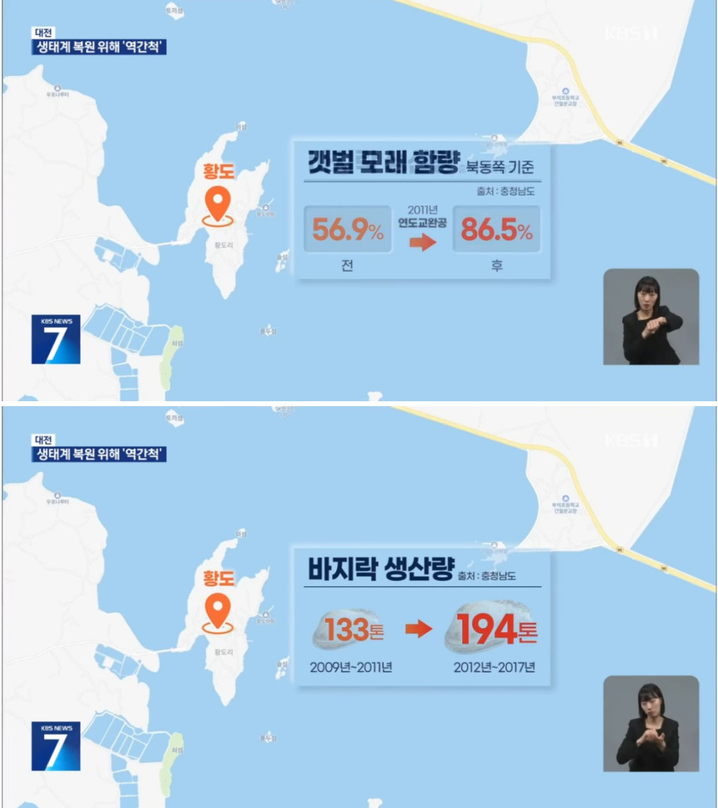 앞서 인근 충남 안면도와 황도를 잇는 연도교를 철거하자 갯벌이 되살아나 바지락 생산량이 느는 등의 효과를 경험한 충남도가 정부에 선제적으로 요청한 결괍니다.