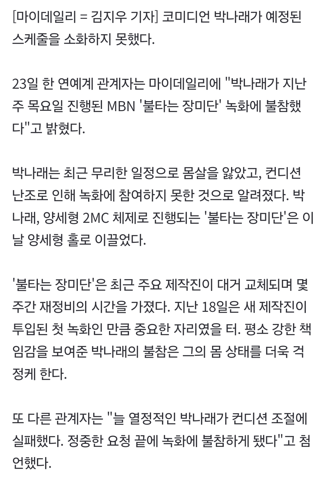 박나래, 바프 무리였나…컨디션 난조 녹화 불참